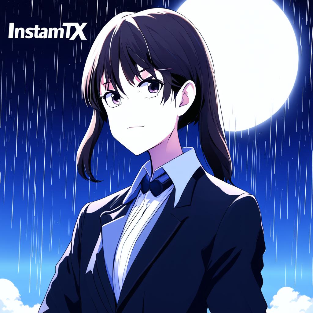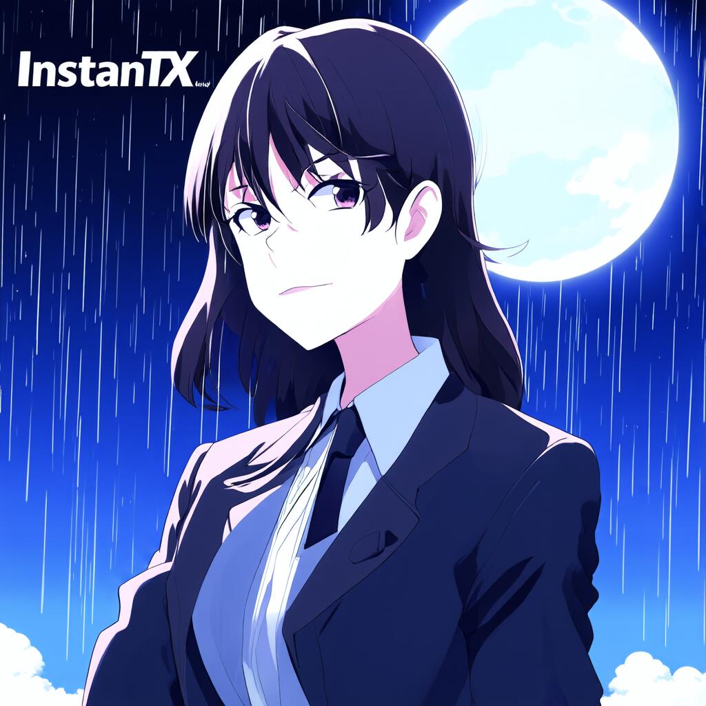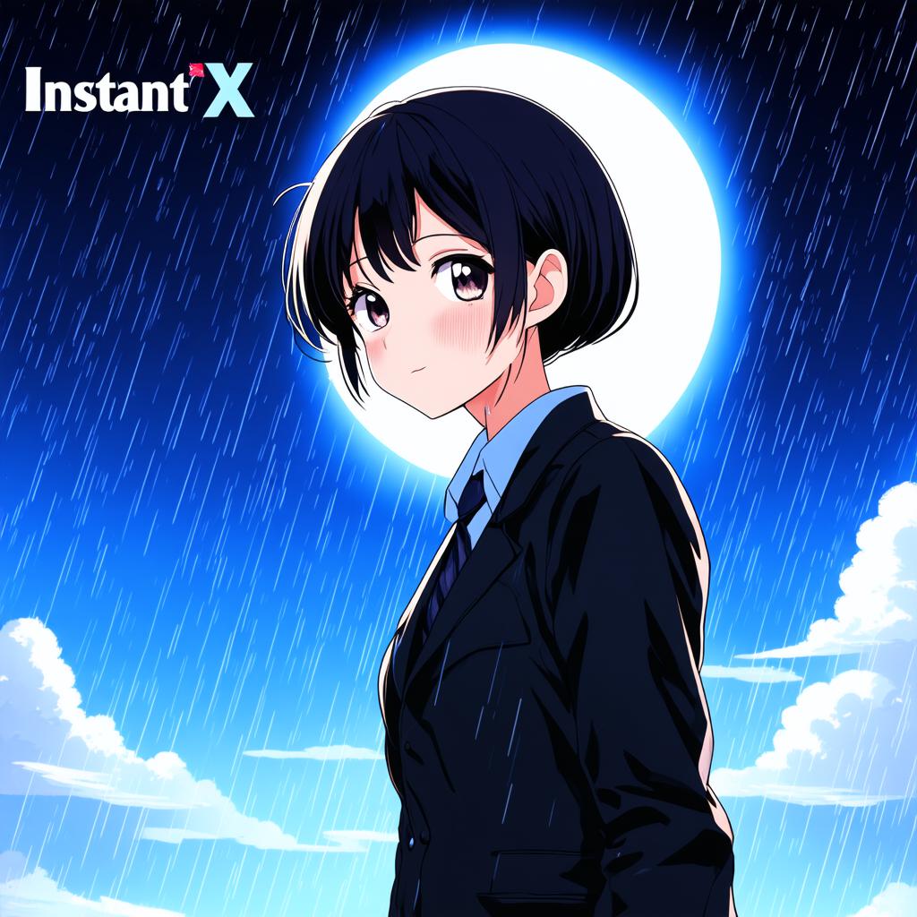 prompt = 'Anime style illustration of a girl wearing a suit. A moon in sky. In the background we see a big rain approaching. text "InstantX" on image'