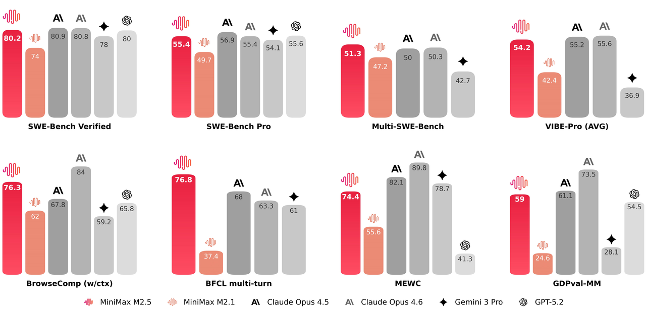 Extensively trained with reinforcement learning in hundreds of thousands of complex real-world environments, M2.5 is SOTA in coding, agentic tool use and search, office work, and a range of other economically valuable tasks, boasting scores of 80.2% in SWE-Bench Verified, 51.3% in Multi-SWE-Bench, and 76.3% in BrowseComp (with context management).
