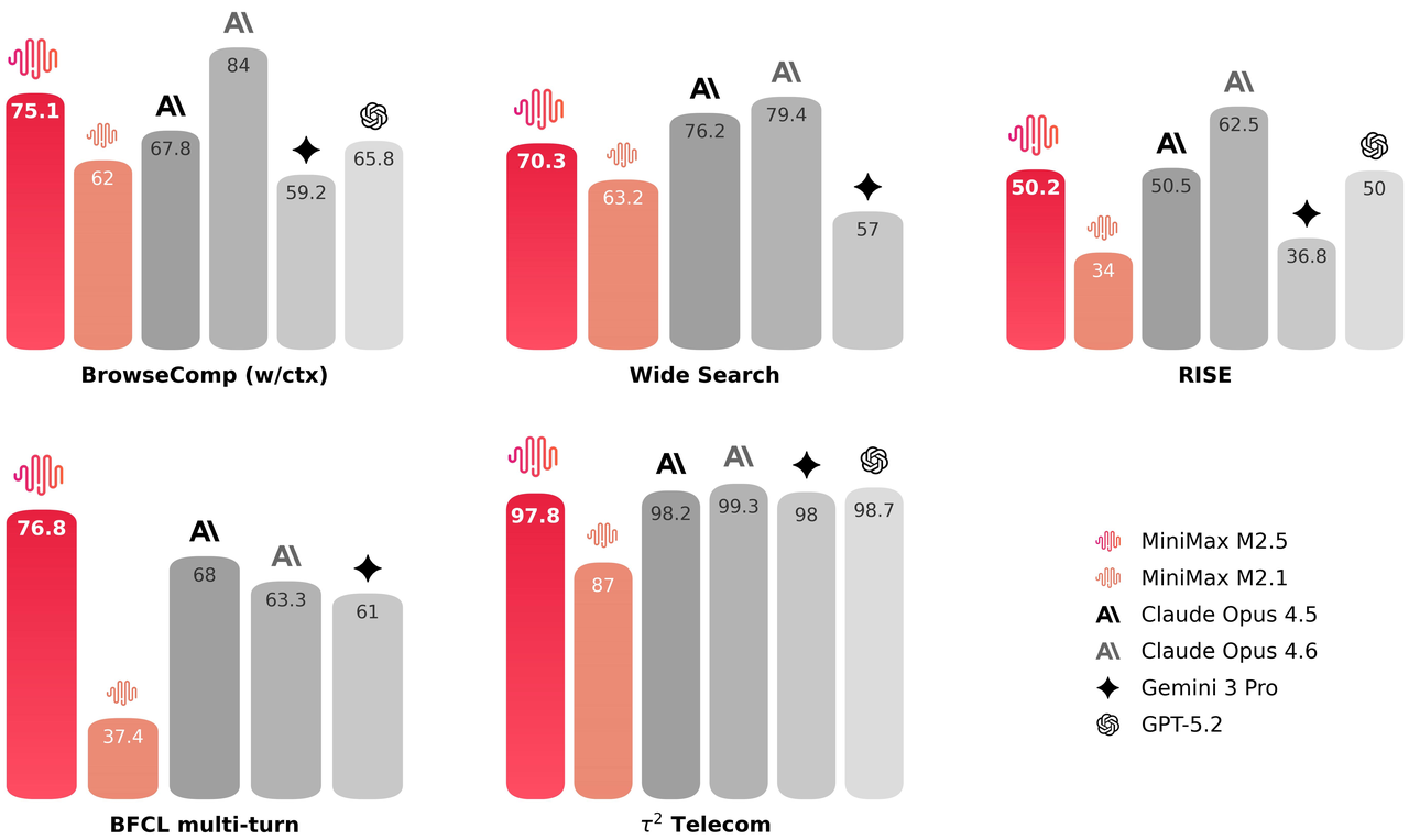 Compared to its predecessors, M2.5 also demonstrates much better decision-making when handling agentic tasks: it has learned to solve problems with more precise search rounds and better token efficiency. For example, across multiple agentic tasks including BrowseComp, Wide Search, and RISE, M2.5 achieved better results with fewer rounds, using approximately 20% fewer rounds compared to M2.1. This indicates that the model is no longer just getting the answer right, but is also reasoning towards results in more efficient paths.
