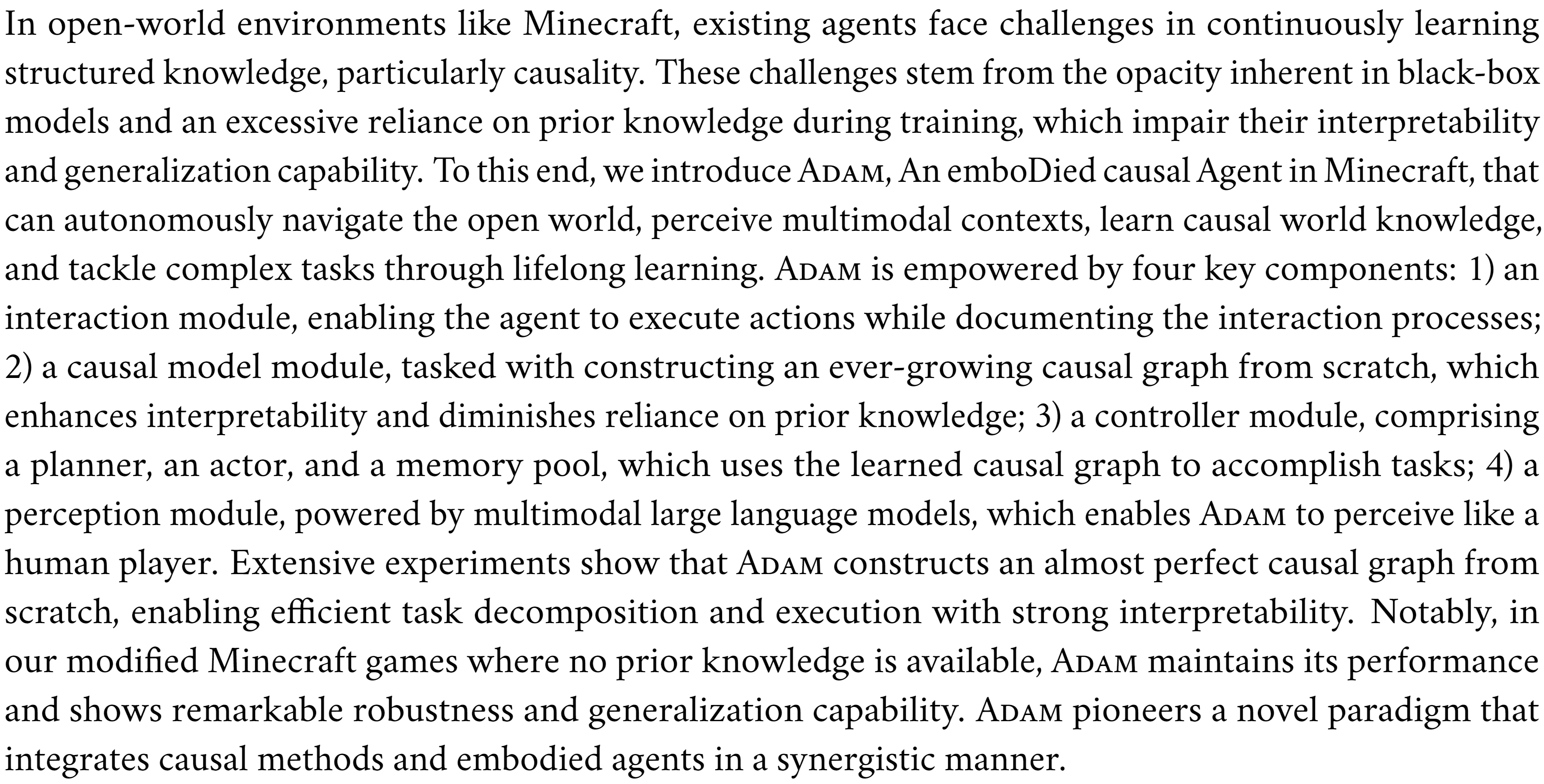 @article{yu2024adam, title = {ADAM: An Embodied Causal Agent in Open-World Environments}, author = {Shu Yu and Chaochao Lu}, year = {2024}, journal = {arXiv preprint arXiv:2410.22194} }
