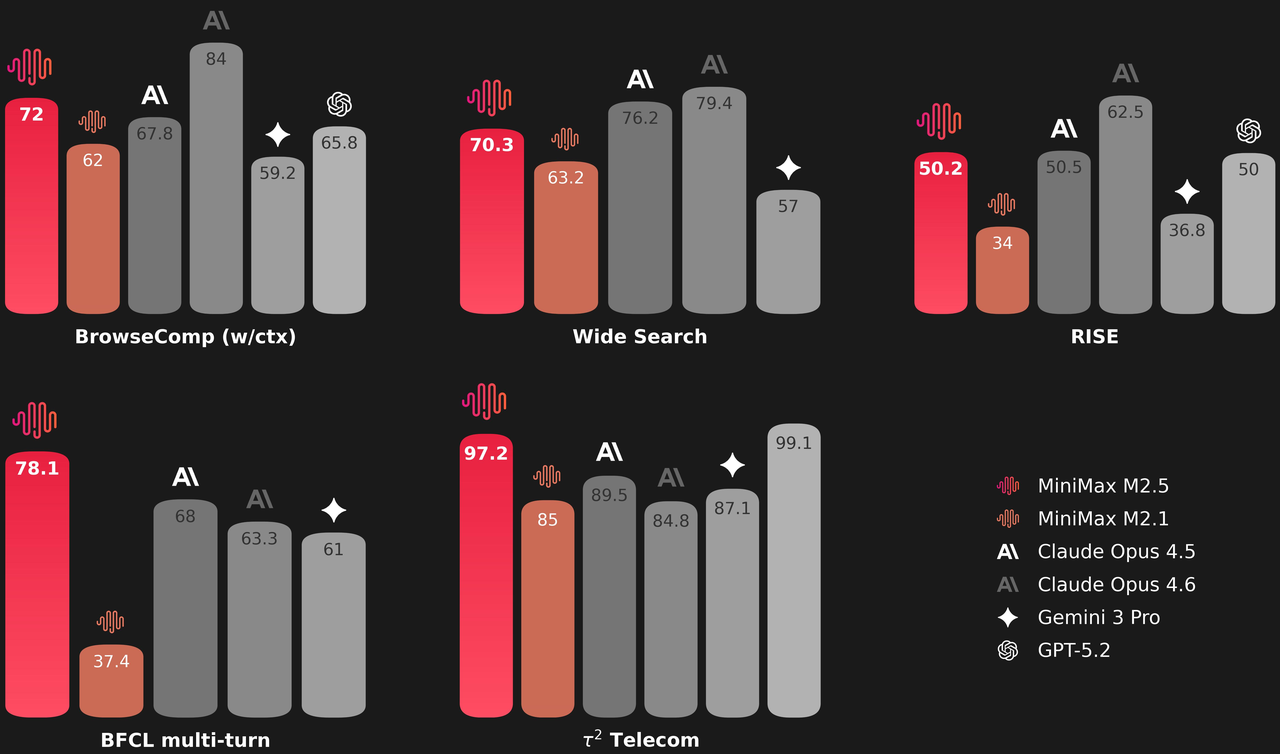 Effective tool calling and search are prerequisites for a model's ability to autonomously handle more complex tasks. In evaluations on benchmarks such as BrowseComp and Wide Search, M2.5 achieved industry-leading performance. At the same time, the model's generalization has also improved — M2.5 demonstrates more stable performance when facing unfamiliar scaffolding environments.