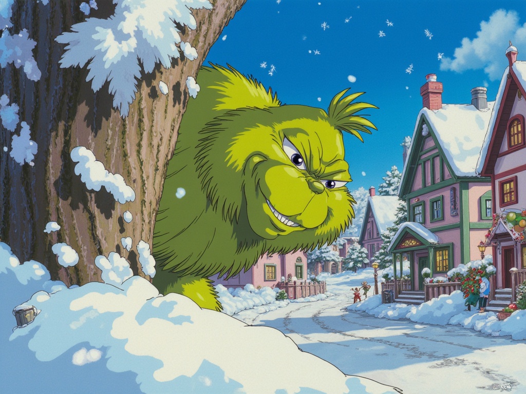- Ghibli style The Grinch, a mischievous green creature with a sly grin, peeking out from behind a snow-covered tree while plotting his antics, in a quaint snowy village decorated for the holidays, warm light glowing from cozy homes, with playful snowflakes dancing in the air