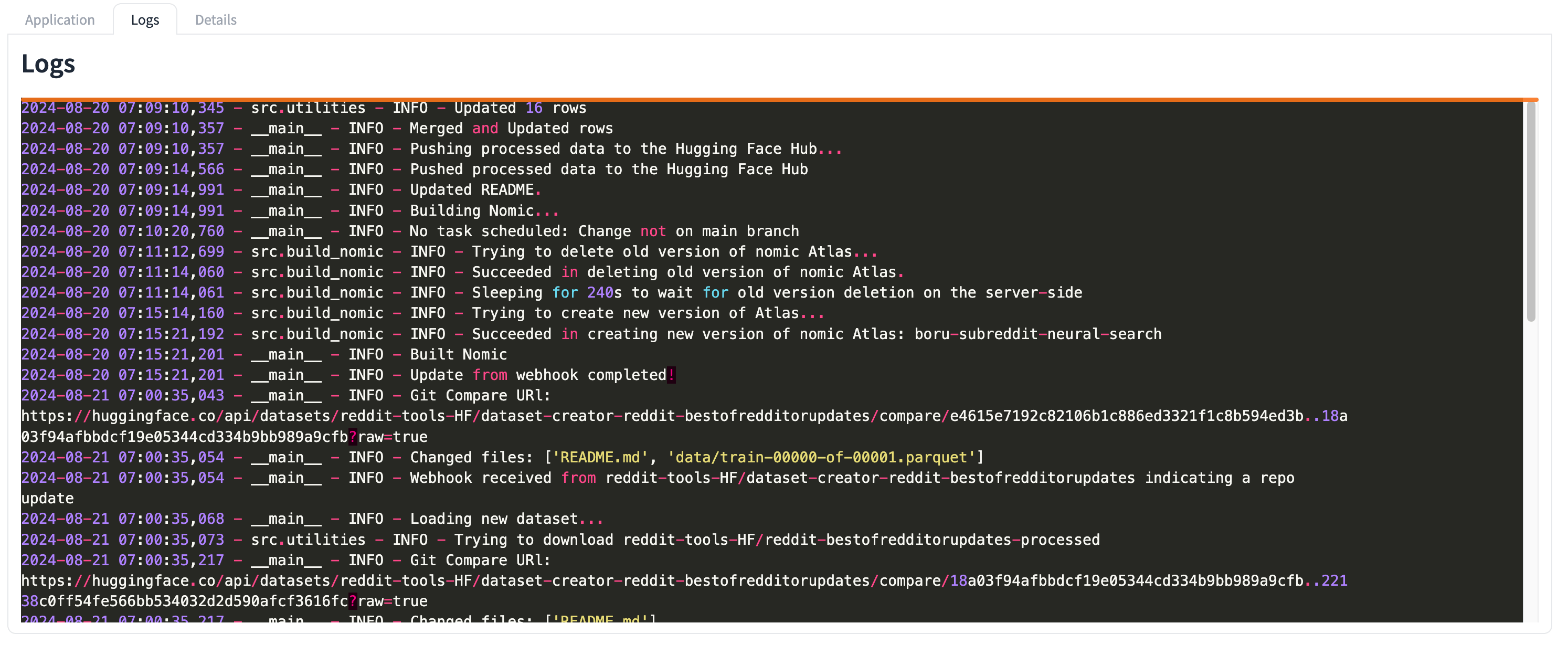 | Dataset Creator Space | Pulls the new Reddit data into a dataset | reddit-tools-HF/dataset-creator-reddit-bestofredditorupdates (space) | - Scheduled dataset pull job - Monitoring of Process 1 via Log Visualization |