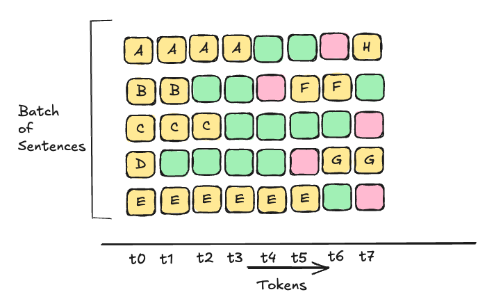 这种批处理序列的类型称为静态批处理。虽然这简单易懂,但它本质上带来了低效率。只有在每个句子完全生成后,我们才能继续下一批。