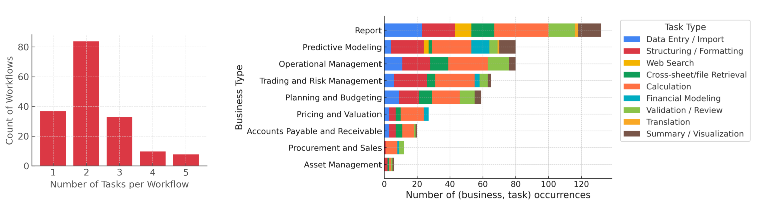 --- license: cc-by-3.0 tags: - agent - workflow - multimodal - spreadsheet - pdf - image - code - finance - accounting - tabular modalities: - text - spreadsheet - pdf - image - code - tabular configs: - config_name: Finch_Dataset_All data_files: - split: test path: - finch_workflows_test.jsonl --- # Finch: Benchmarking Finance & Accounting across Spreadsheet-Centric Enterprise Workflows This repository contains the dataset for **Finch**, an enterprise-grade benchmark for evaluating an agent’s ability to work like a skilled finance & accounting expert (work IQ) on real-world professional workflows. * **Paper**: https://arxiv.org/abs/2512.13168 --- ## Dataset Description Finch focuses on **messy and long-horizon finance & accounting workflows** that span: > data entry/import, structuring/formatting, web search, cross-sheet/file retrieval, calculation, financial modeling, validation, translation, visualization, and reporting. The workflows are derived from **real-world enterprise workspaces** (primarily Enron, as well as corporations in the EUSES Corpus, investment and securities companies, World Bank, Canadian/British government agencies, and more), including: - Enterprise **email threads** where collaborators naturally describe, discuss, and track workflows - Large and messy **spreadsheets** with multimodal artifacts including text, tables, formulas, charts, pivots, images, etc - Interlinked **PDFs and documents** that provide additional business context We adopt a three-step workflow labeling process: 1. **Inducing workflow types and instances** from real collaborative context in **enterprise email threads** ([Enron Corpus](https://en.wikipedia.org/wiki/Enron_Corpus): 500,000 emails from 150 executives and employees). 2. **Deriving concrete workflow instances** by analyzing changes across **spreadsheet versions** (15,000 versioned spreadsheet files from Enron and [EUSES](https://dl.acm.org/doi/10.1145/1082983.1083242)) and designing workflows based on high-quality artifacts from investment and securities companies, World Bank, Canadian/British government agencies, WideSearch, Dabstep, and more. 3. **Conducting meticulous expert annotation** of task instructions, input files, and reference outputs, involving hundreds of hours of expert work. This process yields **172 enterprise-grade workflows—primarily multi-task composite workflows**, involving 1,710 spreadsheets and 27 million cells, capturing the intrinsic **messy, long-horizon, knowledge-intensive, and collaborative nature** of real-world finance & accounting work. 92.4% of workflows involve multiple input and reference sheets, with an average of 8 sheets and a long tail reaching 91 spreadsheets. In this release, we provide full annotations for the first 72 workflows, with the remaining 100 workflows and the evaluation code to be released in a subsequent update before February. We conduct both human and automated evaluations of frontier AI systems including GPT5.1, Claude Sonnet 4.5, Gemini 3 Pro, Grok 4, and Qwen 3 Max. GPT 5.1 Pro spends 16 mins for each workflow on average and gets the highest pass rate of 38%, while Claude Sonnet 4.5 passes just 25.0%, revealing a substantial performance gap for real-world enterprise scenarios. --- ## Examples Example 1: Review the Inv & WC Value Adj summary tab and add the missing cross‑sheet data references to the other worksheets so the roll‑up pulls the correct figures. Return the updated file with those links in place. Example 2: Add a new worksheet named "Scenario3" to the same workbook, mirroring the structure, row/column layout, monthly detail table, and chart area of "Scenario1". For Scenario3, update the hedging assumptions to a balanced allocation: 10-Yr 25%, 5-Yr 20%, 1-Yr 15%, May-Sep 20%, Q3 15%. Keep the note "Maximum Monthly Average Short Position to Cover (July Peak) = 30,508 MW" unchanged; only the new sheet should be added, and formulas may be used within it. Example 3: Transcribe the content from the image into the Excel file. Example 4: Per the red parameters and the Method 1/Method 2 guidance noted in H8 and H9, complete the formulas in columns T and U (starting from1), Note that the starting point for the formulas in columns T and U is 1, representing the initial signal to hold Index 1. In the formulas for columns T and U, 1 represents the signal to hold Index 1, -1 represents the signal to hold Index 2, and 0 represents the signal to make no change. Then complete column I. The method selection in B11 should drive the model so that all cells and charts refresh consistently when switching between methods. --- ## 📁 Dataset Structure The corpus is released in **JSONL** format. Each line corresponds to one **workflow-centric example**: ```json { "id": "", "instruction_en": "", "source_files": ["", "..."], "source_files_urls": ["", "..."], "reference_outputs": { "files": [""], "text": "" }, "reference_file_urls": [""], "task_type": "", "business_type": "", "task_constraints": "" } ``` Annotations of Finch should **NOT** appear in training corpora. --- ## 📣 Feedback & Issues If you find any issues with the dataset or have suggestions, please open a discussion in the **Community** tab — we value your feedback! ## Citation ```bibtex @article{dong2025finch, title={Finch: Benchmarking Finance \& Accounting across Spreadsheet-Centric Enterprise Workflows}, author={Dong, Haoyu and Zhang, Pengkun and Gao, Yan and Dong, Xuanyu and Cheng, Yilin and Lu, Mingzhe and Yakefu, Adina and Zheng, Shuxin}, journal={arXiv preprint arXiv:2512.13168}, year={2025} } ``` **📧 Contact:** donghaoyu82@gmail.com