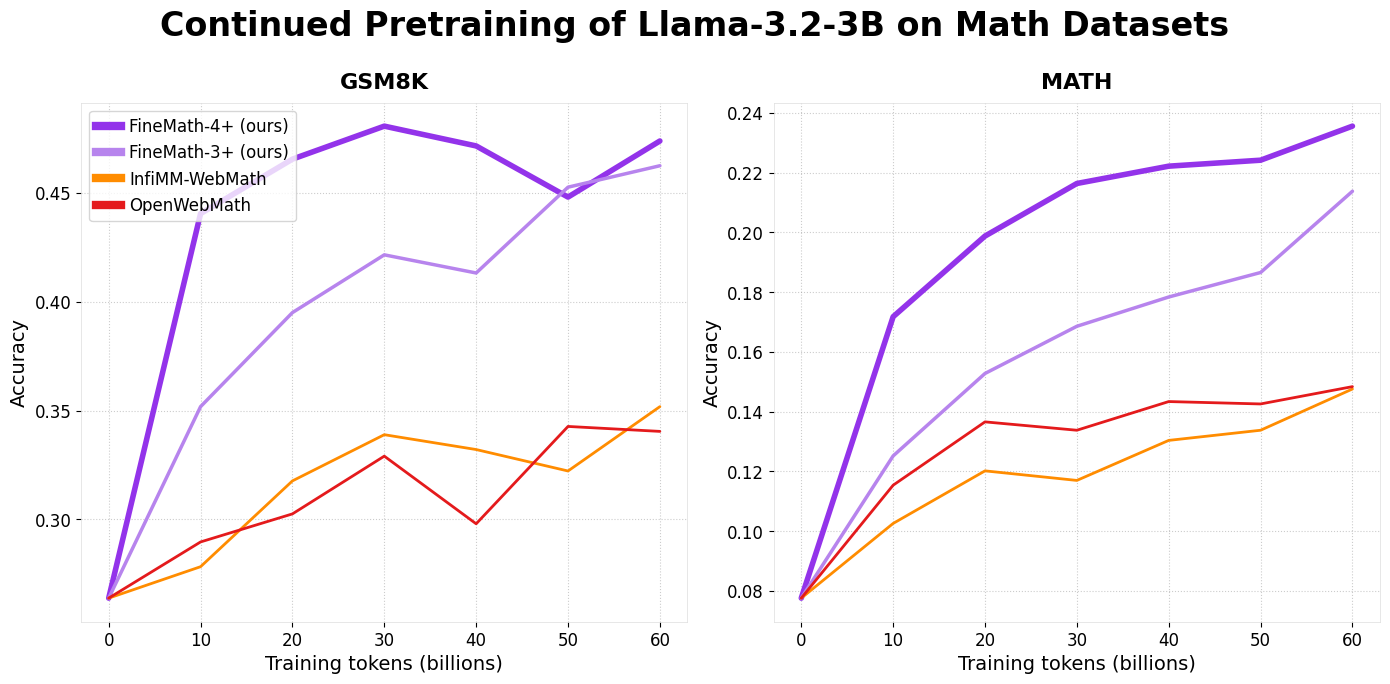 - FineMath-3+ outperforms the base InfiWebMath on GSM8k and MATH benchmarks