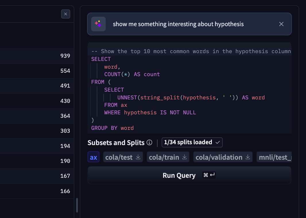 You can run SQL queries on the dataset in the browser using the SQL Console. This feature also leverages our auto-conversion to Parquet.