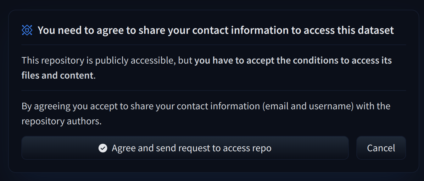 By default, users landing on your gated dataset will be asked to share their contact information (email and username) by clicking the Agree and send request to access repo button.