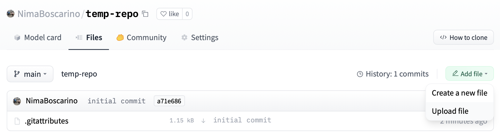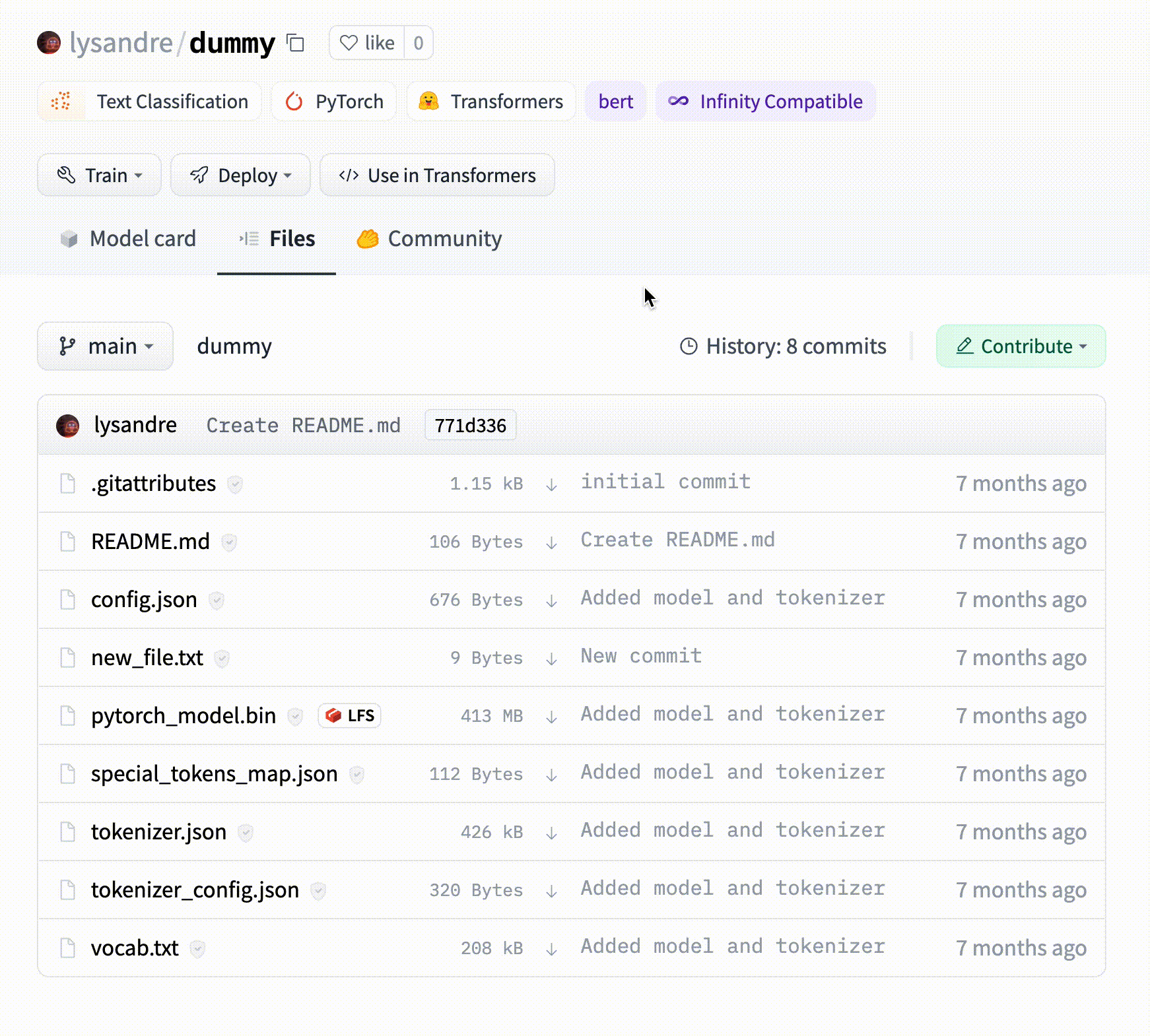 Every time you go through the add-commit-push cycle, the repo will keep track of every change you’ve made to your files. The UI allows you to explore the model files and commits and to see the difference (also known as diff) introduced by each commit. To see the history, you can click on the History: X commits link.