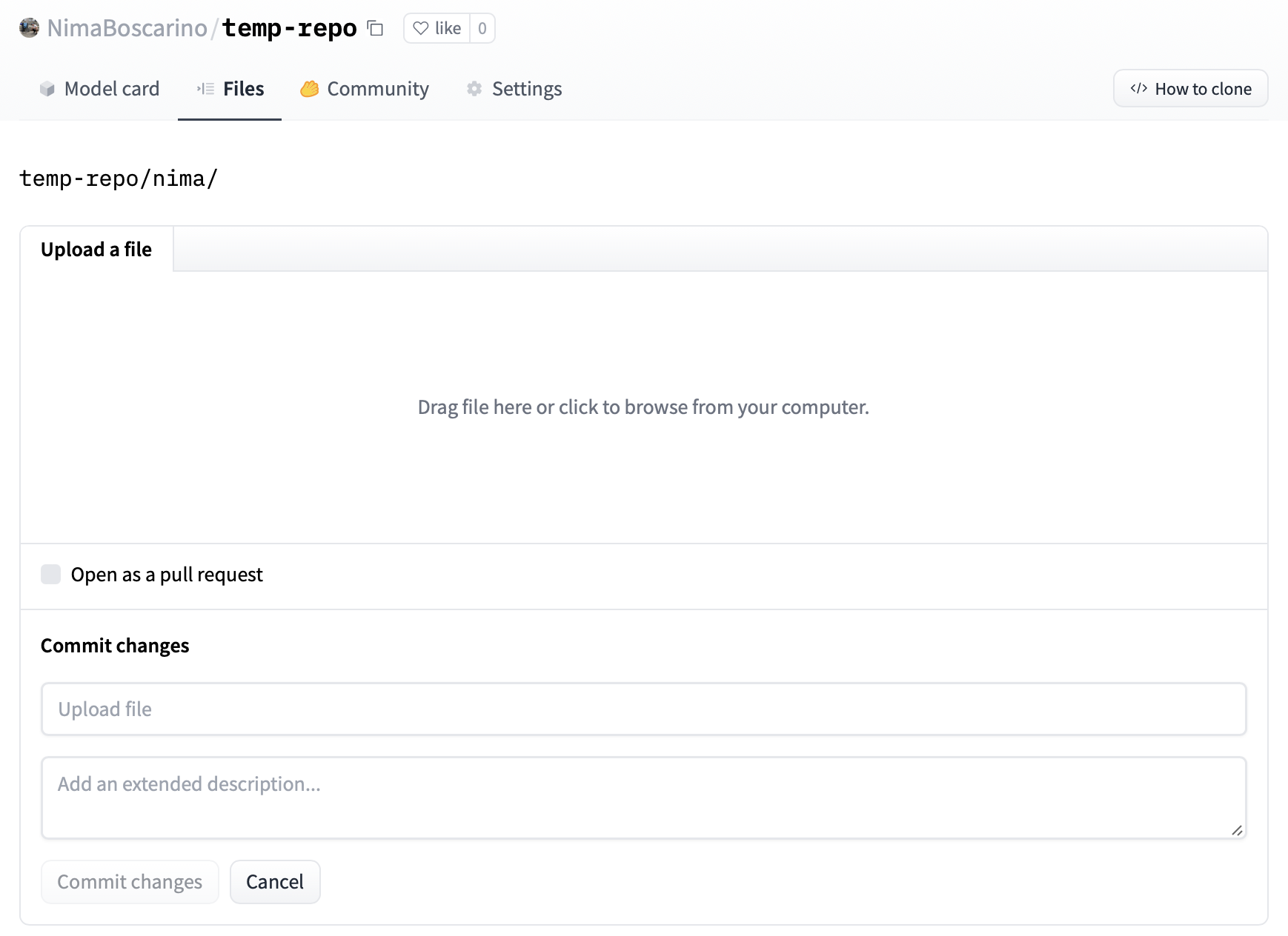 Note that the Hub prompts you to create a Model Card, which you can learn about in the Model Cards documentation. Including a Model Card in your model repo is best practice, but since we’re only making a test repo at the moment we can skip this.