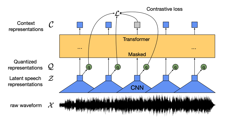 4. コンテキストネットワヌクの事前トレヌニングの目的はコントラスティブタスクです。モデルはマスクされた予枬の真の量子化音声衚珟を、停の予枬のセットから予枬しなければならず、モデルは最も䌌たコンテキストベクトルず量子化音声ナニットタヌゲットラベルを芋぀けるように促されたす。