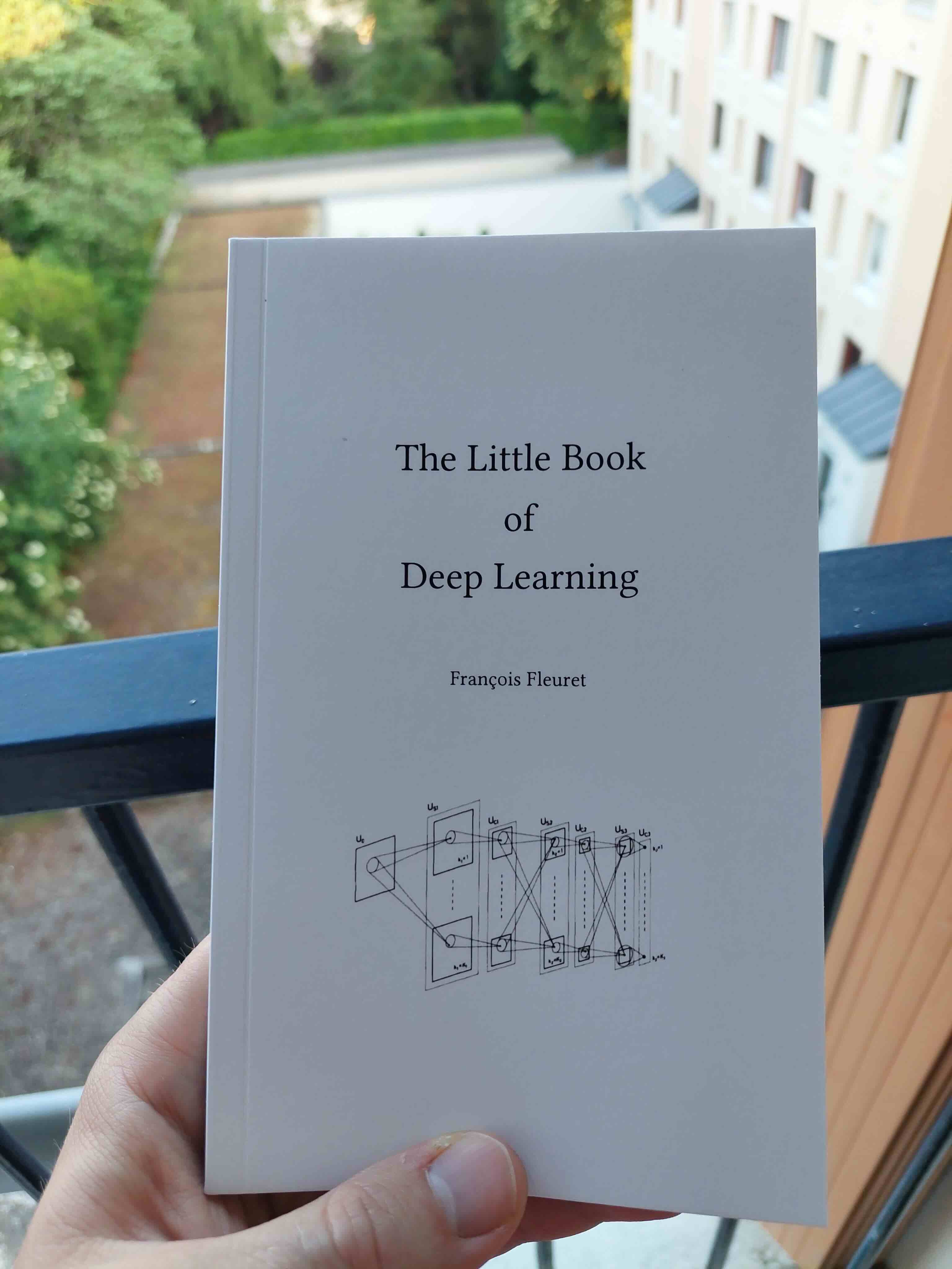 What is the title of this book? answer briefly The title of the book is "The Little Book of Deep Learning". Where is the person standing? answer briefly The person is standing on the balcony. Describe the image The image shows a person holding a book with a cityscape visible through the window behind them. The book has a cover with a title that reads "The Little Book of Deep Learning" in bold letters. |